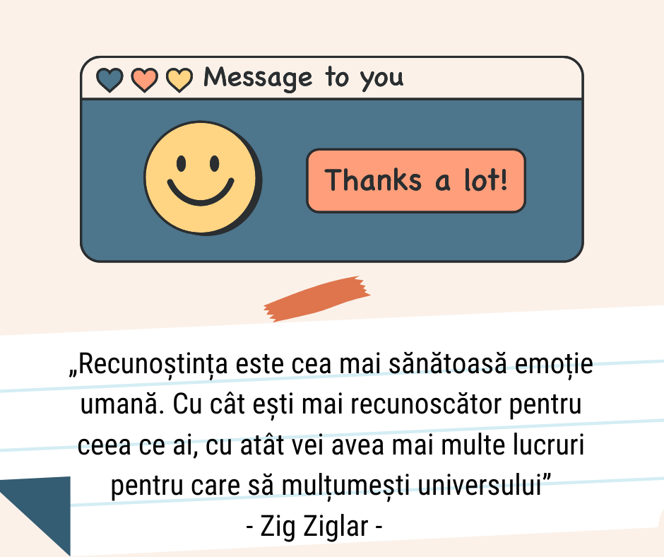 Odată cu trecerea vremii și timpului, se pare că tot mai puțin auzim cuvinte de mulțumire pe care să și le adreseze oamenii unii altora. Deși este simplu să fim recunoscători, și toți avem motive de a fi recunoscători, nu toți știm să ne exprimăm aprecierea, să apreciem oamenii, lucrurile și experiențele pe care le întâlnim în viața noastră. Pentru a fi recunoscători trebuie să observăm lucrurile și oamenii din viața noastră. Să vedem cum sunt ele pregătite pentru noi. Trecând de observație, ne vom întreba de ce am primit noi aceste lucruri. De ce au intrat în viața noastră anumiți oameni, iar după ce si-au încheiat misiunea au dispărut brusc? Ce am simțit noi, și cum ne-au făcut să ne simțim? Aceste trăiri să încercăm să le manifestăm prin sentimentul de recunoștință. Un sentiment care aduce cu el gânduri și cuvinte magice. Să învățăm să adresăm cuvinte de: te iubesc, mulțumesc, iartă-mă, îmi pare rău. Să învățăm să acceptăm persoanele pentru ceea ce sunt pentru că fiecare are valoarea sa, iar pentru ceea ce fac să le oferim mereu un feed-back pozitiv de apreciere. Recunoștința nu este un sentiment complicat, este ceva ce putem face cu toții, și vom primi la schimb o stare de bine.